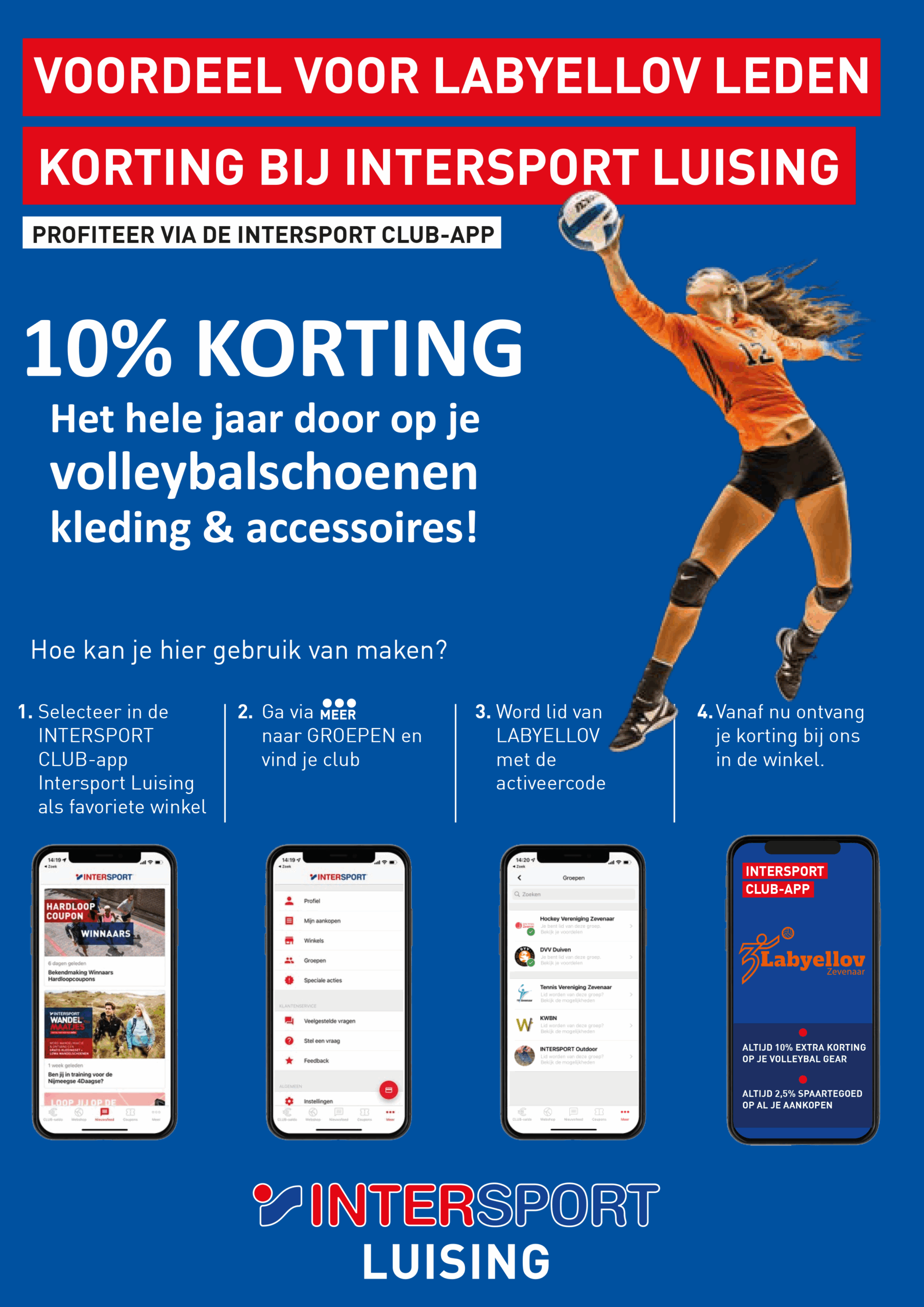 We hebben goed nieuws voor jullie! Dankzij onze samenwerking met Intersport Luising in Zevenaar kunnen jullie als lid van Labyellov het hele jaar door profiteren van 10% korting op al jullie volleybalgear. Daarnaast spaar je automatisch 2,5% shoptegoed op al je aankopen.
